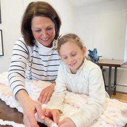 Experiences make the best gifts! In this case, a gift for your child (or parent) is a gift for you, too! You will both learn a new skill, spend some quality time together AND walk away with a gorgeous blanket. A no brainer! This is a special workshop designed for a parent and child (or similar) to hand knit one blanket together! One person must be over 21. 9 years old is the minimum age to attend. Come with your 10 year old daughter, your eighty year old mom, your college age grandson, your amazing niece, you get the idea! ***Please note the biggest obstacle for an 9 year old to complete this blanket is boredom! Kids can do the hand knitting part better than the adults, but three and a half hours is a long time to do the same thing over and over! Please consider this when signing up your younger guest. The workshop fee includes ONE blanket and spots for TWO people. Please note the name and age of your guest, as well as yarn color, in the sign ups. We stock neutral yarn colors in ivory, white, pink, taupe, spa blue, light gray, country blue and sage green (see photos). **Please indicate preference in text box when booking to guarantee color selection** REP YOUR COLLEGE/PRO TEAM WITH SPIRIT YARN in 40 ADDITIONAL COLORS. We need a minimum of 7 days lead time for these colors and there is an additional $10 charge for this yarn. College, NFL, NBA, MLB, Pantone colors are available. If you need help selecting these colors, enter HELP in the text box when registering and we will contact you. We are here to help!